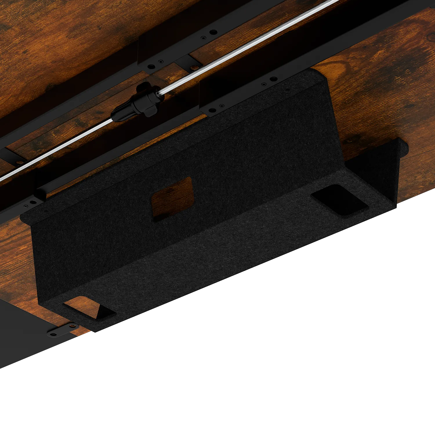 Провода – это хаос, который крадет твою концентрацию. Мы его уничтожили. Двухуровневая система организации скрывает все лишнее от глаз, сохраняя доступ к необходимым устройствам. Аккуратный кабель-канал с правой стороны столешницы принимает провода от мониторов и периферии, незаметно направляя их вниз. Там их подхватывает просторная фетровая корзина – никаких висящих шнуров, визуального шума или риска зацепиться ногой. Только чистое пространство, которое выглядит безупречно и настраивает на абсолютный фокус. Порядок на столе – порядок в мыслях.