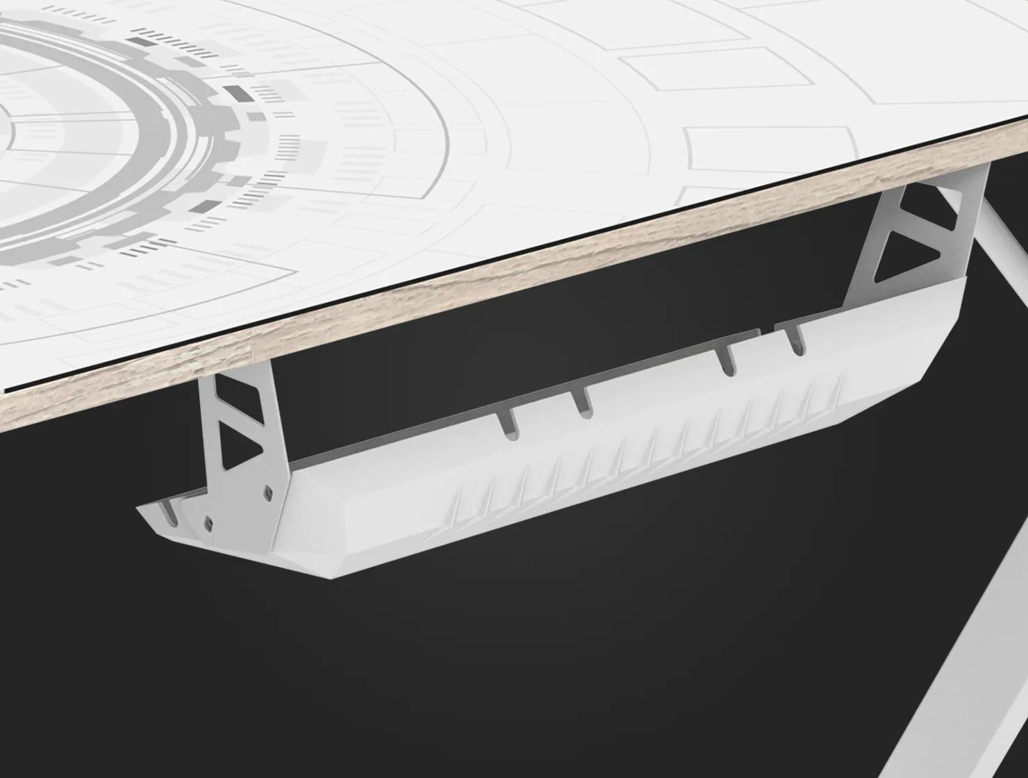 Для удобства и организации рабочего пространства в оголовье стола присутствует специальная выемка, также по обе стороны столешницы располагаются 2 выемки, позволяющие убрать все провода и кабели с рабочей поверхности.
